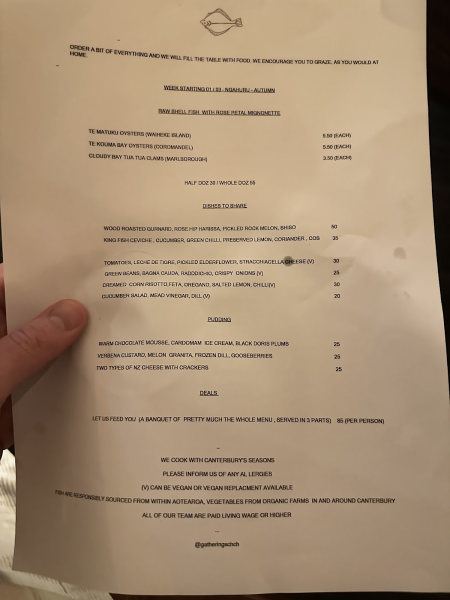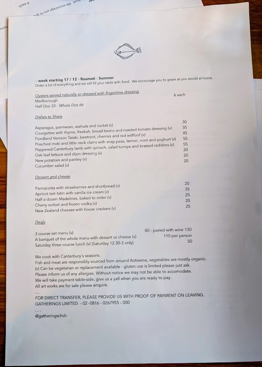 Gatherings Restaurant’s menu at 5/2 Papanui Road, Merivale strikes a confident balance between fresh, seafood-forward cooking and playful, comfort-driven bites, with each highlighted dish feeling purposeful rather than decorative. Starting light, the Salad works as a clean, refreshing reset before you lean into richer plates. Seafood is clearly the headline act: Roasted Flounder with Cider Butter Sauce delivers that satisfying contrast of delicate fish and a warm, tangy-silky finish, while the broader Fish Menu reinforces how much care is put into freshness, texture, and simple but clever seasoning. For something punchier, Karage Mussels bring an addictive crispness and bold savoriness that’s easy to keep reaching for, and Lemon Sole with Smoked Butter is an elegant, aromatic take that layers brightness with a gentle smoky depth. The kitchen also has fun with vegetables and small plates-Burnt Avocado with Yam Chips offers smoky creaminess against crunchy sweetness, and Eggplant Yumminess is exactly what it promises: a deeply satisfying, well-handled eggplant dish that doesn’t feel like an afterthought. Even the snacks and starters show imagination, especially Kingfish Tartare with Pickled Gooseberries and Other Goodness, which lands as bright, briny, and sharply refreshing thanks to the pickled lift. Dessert keeps the same creative energy: Chocolate Mousse Croquette feels indulgent and playful, and Vanilla Cream Caramal rounds things off with smooth, comforting sweetness. If you want a crowd-pleasing finish to the experience, Absolutely Fabulous earns its name as a memorable final note that ties the meal together with personality.